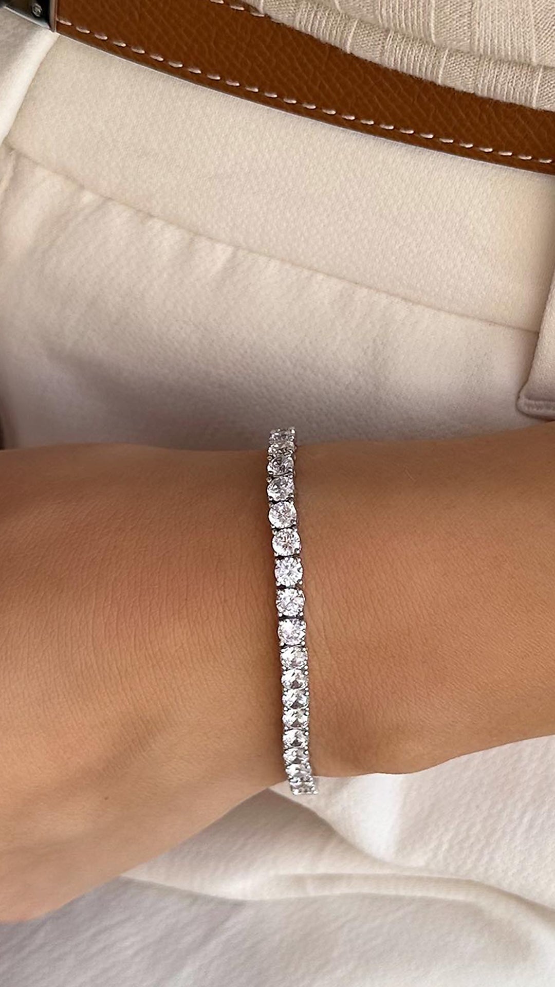 ✥The image showcases a stunning Round Cut Diamond design in this elegant Moissanite Tennis Bracelet For Her. Featuring perfectly matched round cut moissanite stones that deliver exceptional brilliance, this classic tennis bracelet exudes timeless sophistication and refined luxury. Expertly crafted for lasting durability and a comfortable, secure fit, it’s perfect for elevating everyday style or adding sparkle to special occasions. The continuous line of shimmering stones highlights each diamond’s fire and clarity. Celebrate her elegance with this radiant and unforgettable moissanite bracelet.