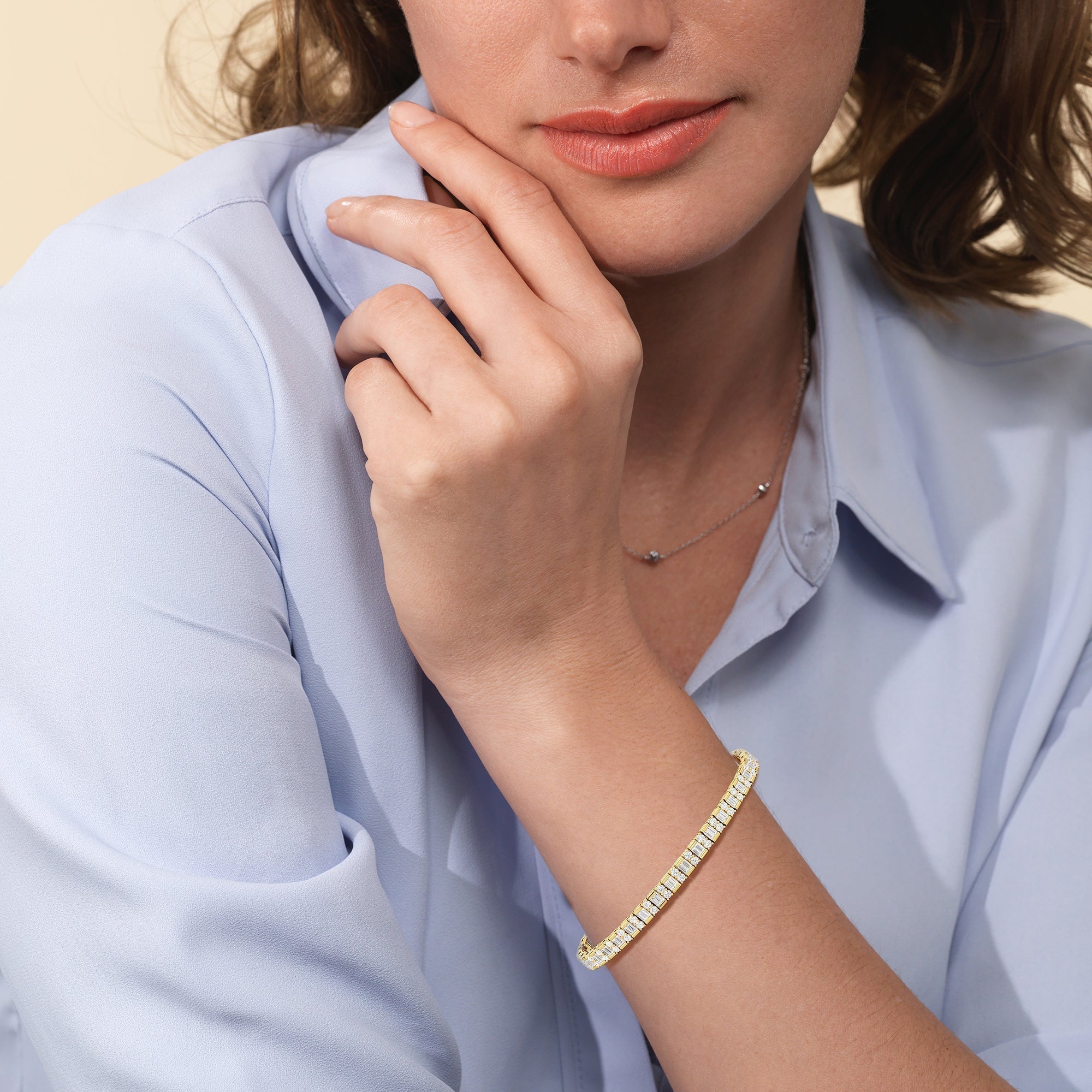 ✥The image features a Unique Baguette & Round Diamond Moissanite Tennis Bracelet, crafted to showcase an exquisite blend of modern design and timeless sparkle. The alternating Baguette and Round Cut stones create a captivating contrast, giving the bracelet a distinctive rhythm and visual interest. Expertly set to maximize brilliance, this piece combines the sharp elegance of baguettes with the fiery sparkle of round diamonds. Perfect for special occasions or elevating everyday style, this Moissanite Tennis Bracelet stands out as a sophisticated and trending choice. Its unique design makes it a must-have for jewelry lovers seeking both luxury and individuality.