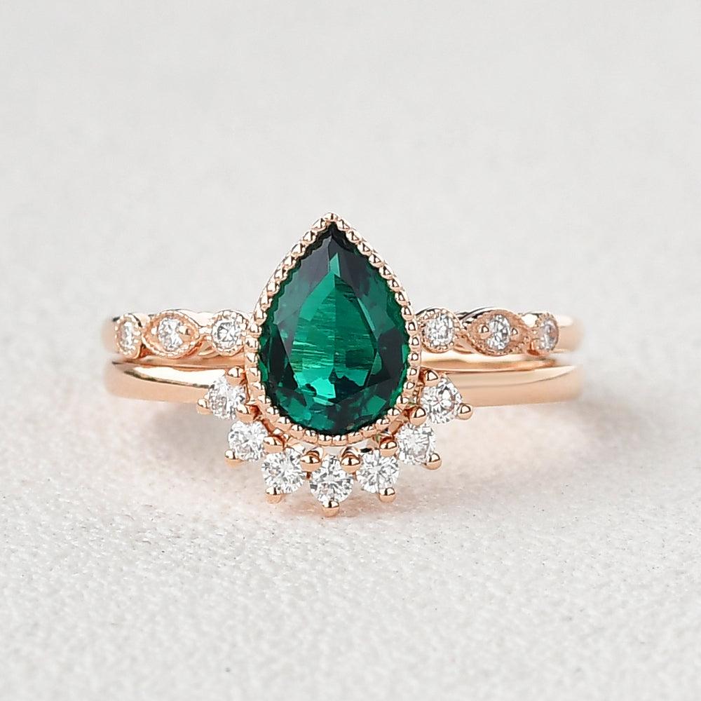 1.93ct Pear Emerald Migraine Vintage Signature Bridal Ring Set For Her