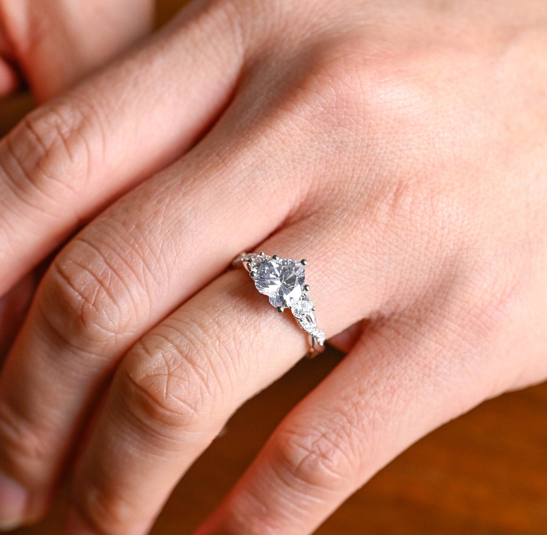 ✥This 1.0CT heart cut three stone twisted pave moissanite engagement ring is a romantic masterpiece. The engagement ring showcases a brilliant heart-shaped moissanite center stone, symbolizing deep love and devotion. Two dazzling side stones enhance its brilliance, while the twisted pave band adds a modern and elegant touch. Perfect for those who appreciate intricate details and timeless beauty, this heart diamond ring is an unforgettable choice for a meaningful and stunning proposal.