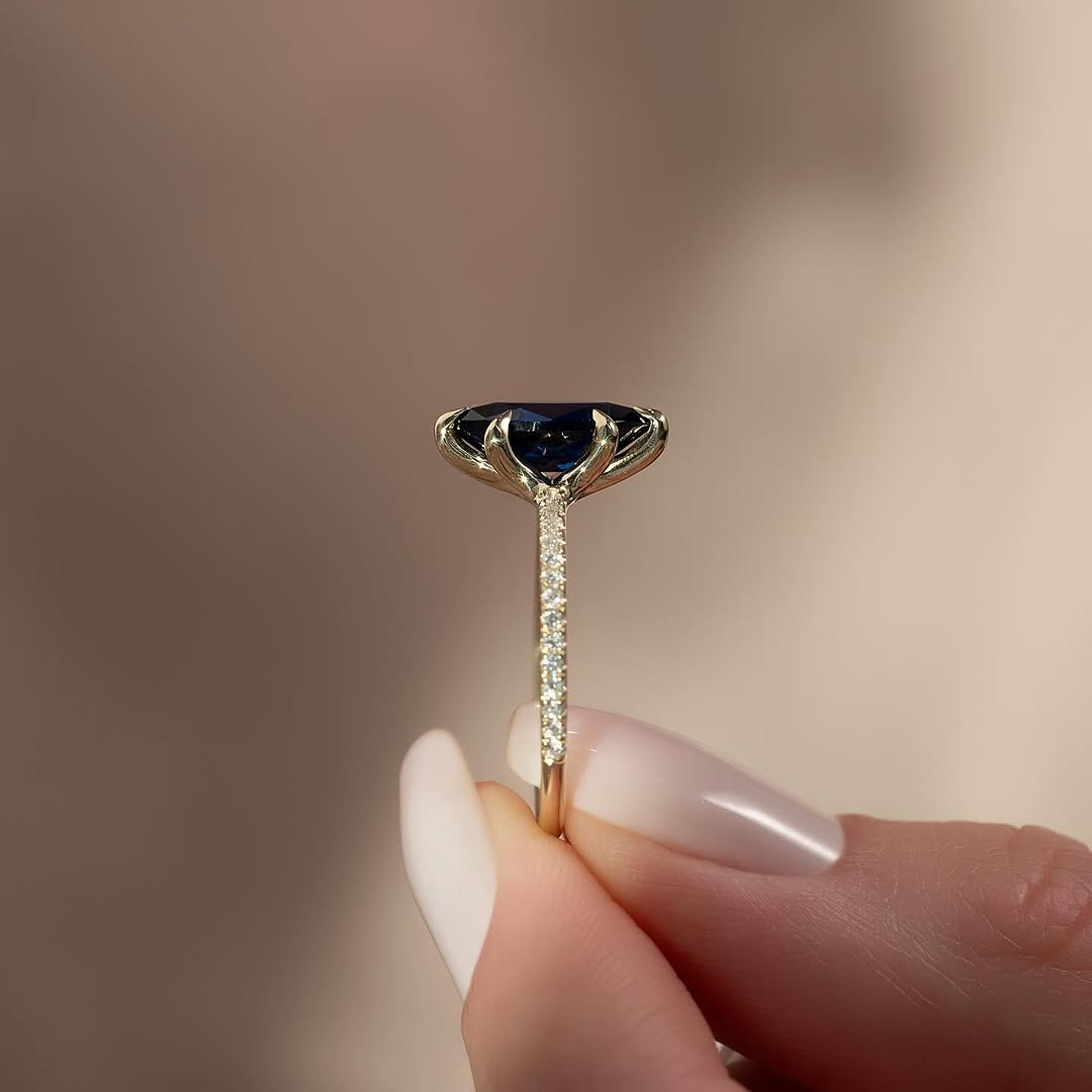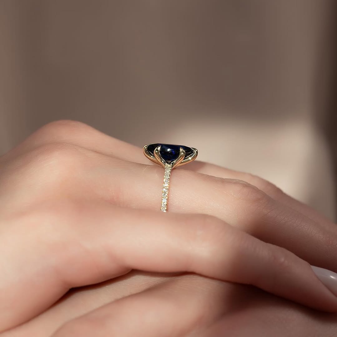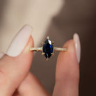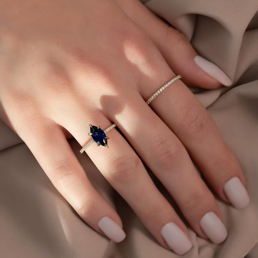✦Embrace elegance with this 1.50CT Blue Sapphire Marquise Lab-Grown Engagement Ring. The striking marquise shape is accented with a sparkling diamond pave setting, highlighting the deep, captivating blue of the sapphire. Crafted with ethically sourced lab-grown stones, it blends luxury with sustainability. Perfect for those who love unique, timeless designs with a modern touch. This ring is a bold statement of style and commitment.