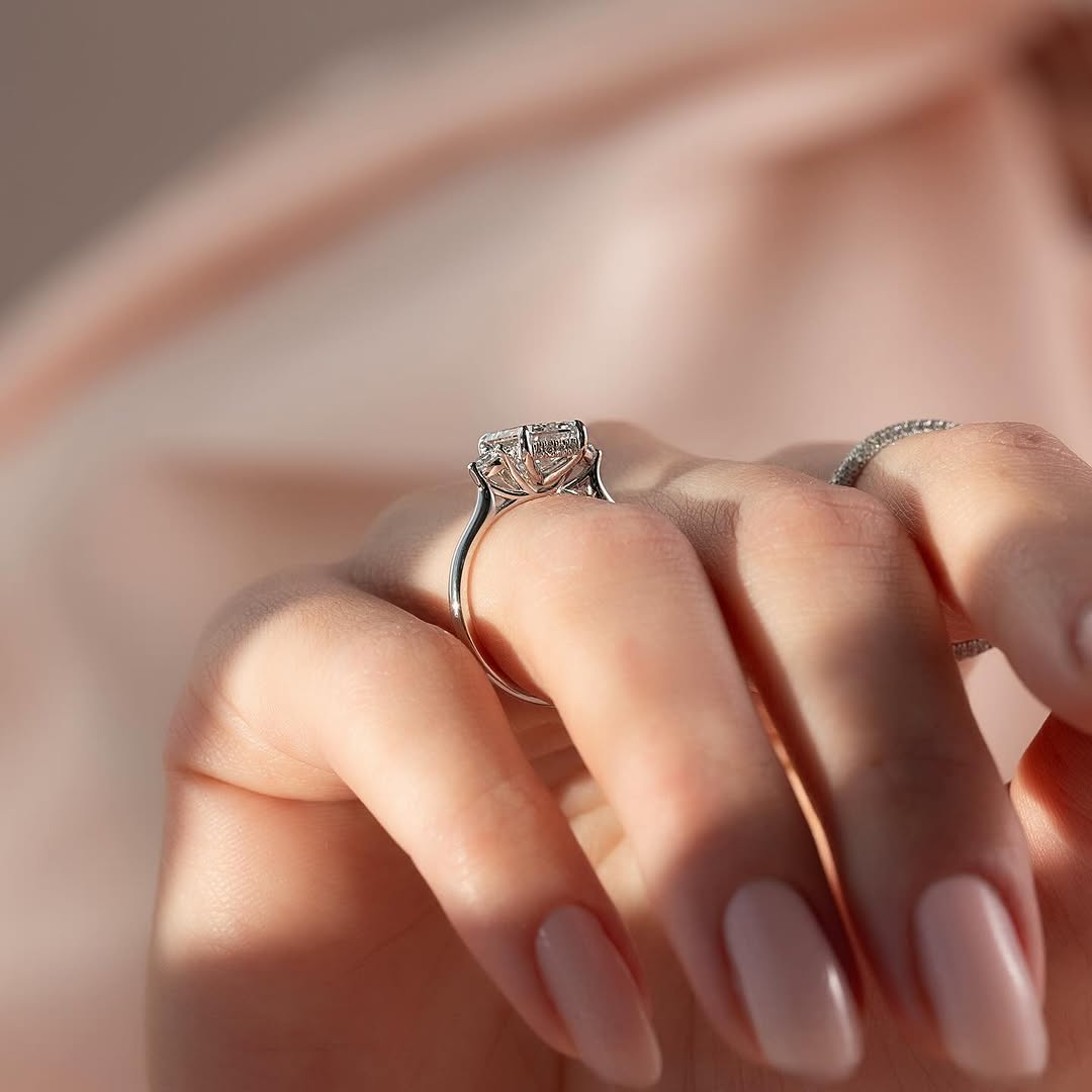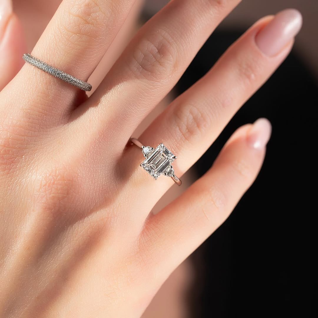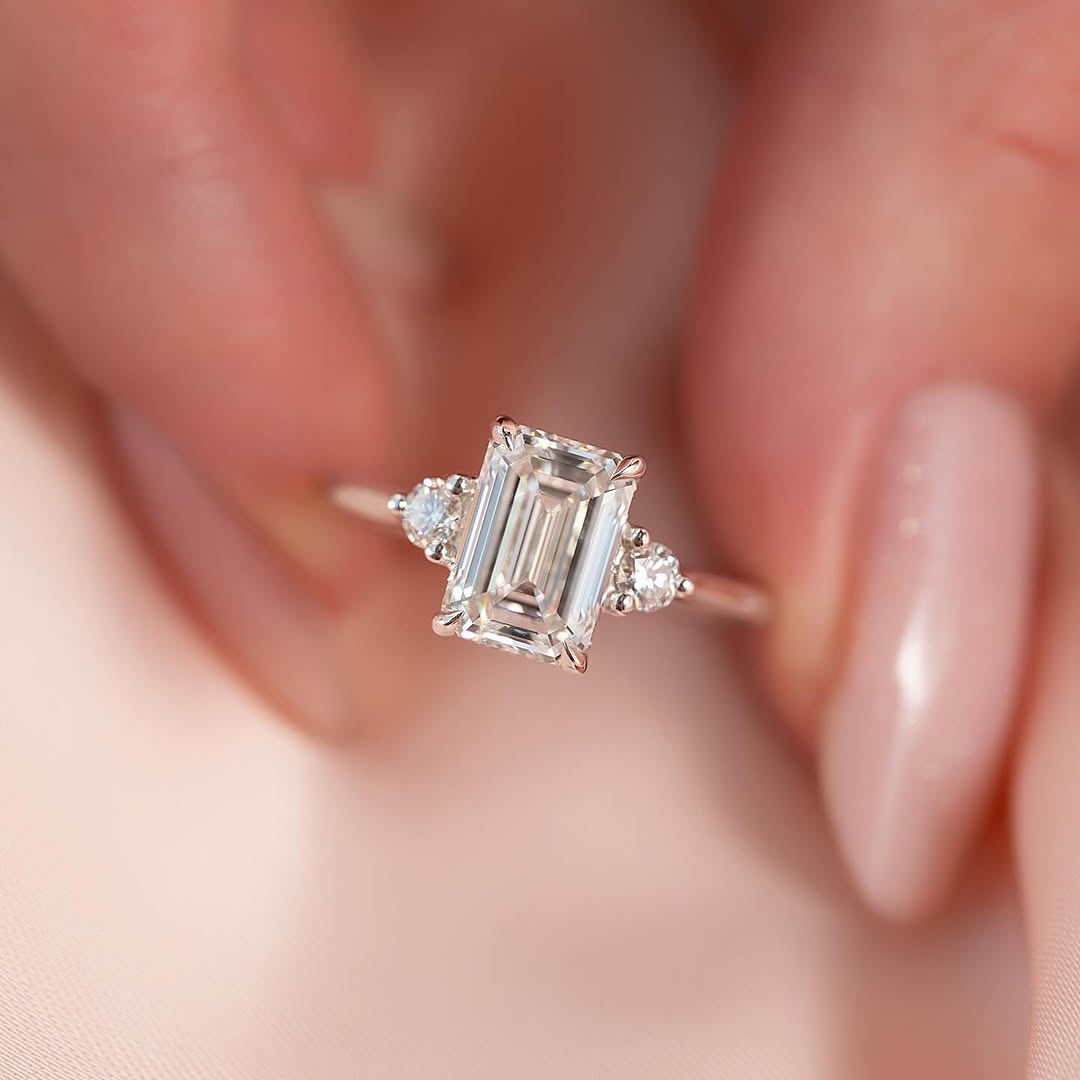 ✦Celebrate your journey with this 2.0CT Emerald Cut Diamond Three-Stone Lab-Grown Engagement Ring. The elegant emerald-cut center stone is beautifully complemented by two sparkling side stones, symbolizing the past, present, and future. Crafted with ethical lab-grown diamonds, it offers sustainable luxury with timeless sophistication. Designed to highlight clean lines and refined brilliance, it creates a graceful yet striking look. This ring is a meaningful symbol of love and everlasting commitment.