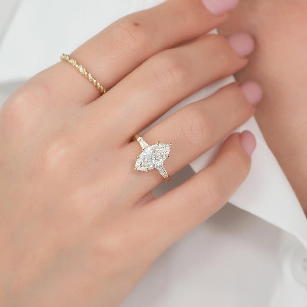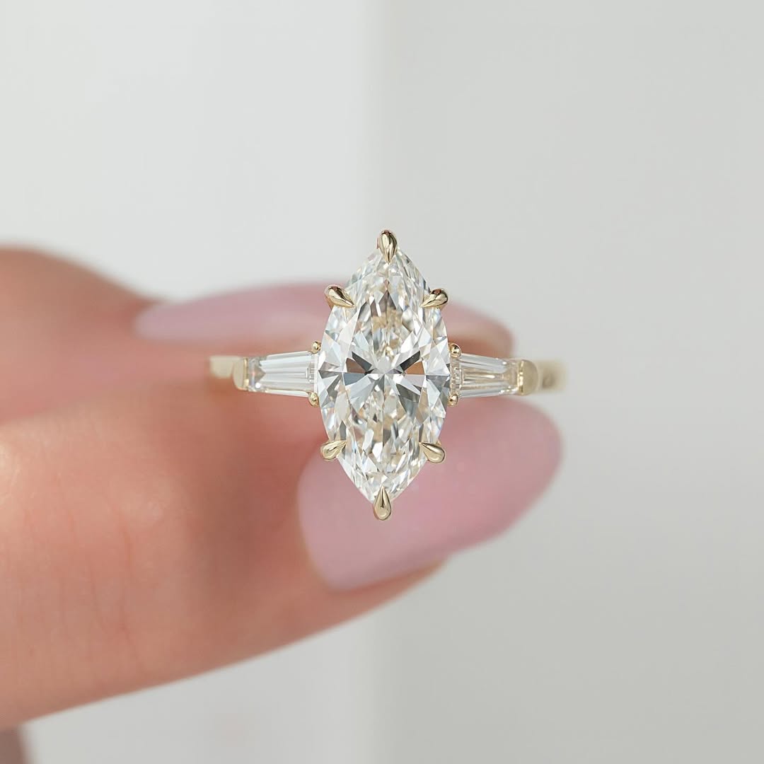 ✦A stunning 2.0CT marquise cut lab grown diamond takes center stage in this elegant three-stone engagement ring, flanked by two sparkling side stones. The marquise shape elongates the finger while maximizing brilliance, and the side stones add meaningful symbolism of past, present, and future. Crafted with ethically sourced lab grown diamonds, it offers a sustainable and luxurious choice. Perfect for those who love timeless elegance with a modern touch.