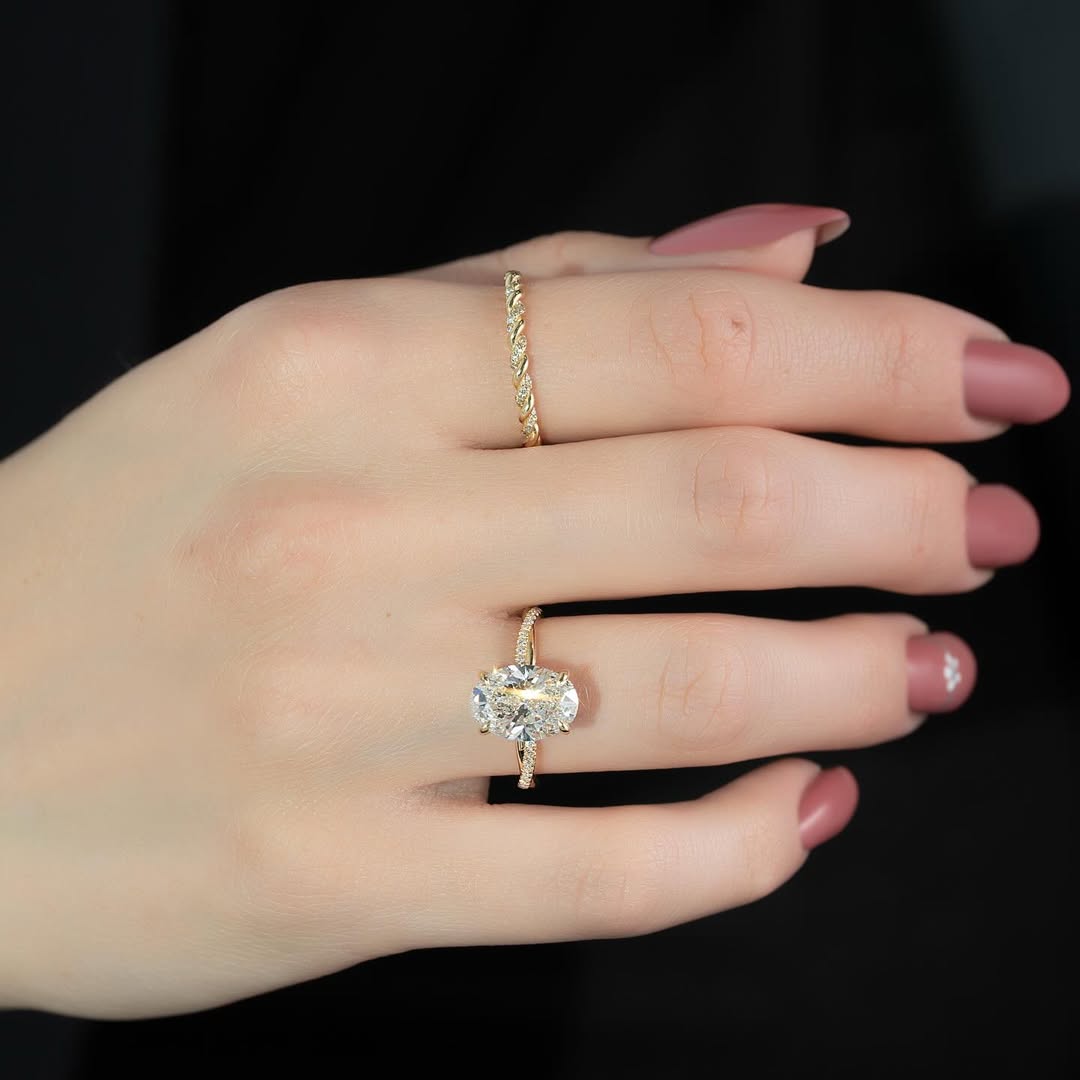 ✦A stunning 2.50CT oval cut lab grown diamond takes center stage in this twisted pavé setting engagement ring, showcasing graceful brilliance and elegance. The twisted pavé band adds movement and sparkle, enhancing the ring’s modern and luxurious appeal. Crafted with ethically sourced lab grown diamonds, it offers sustainable luxury with timeless style. Perfect for those who love contemporary design with classic sophistication.