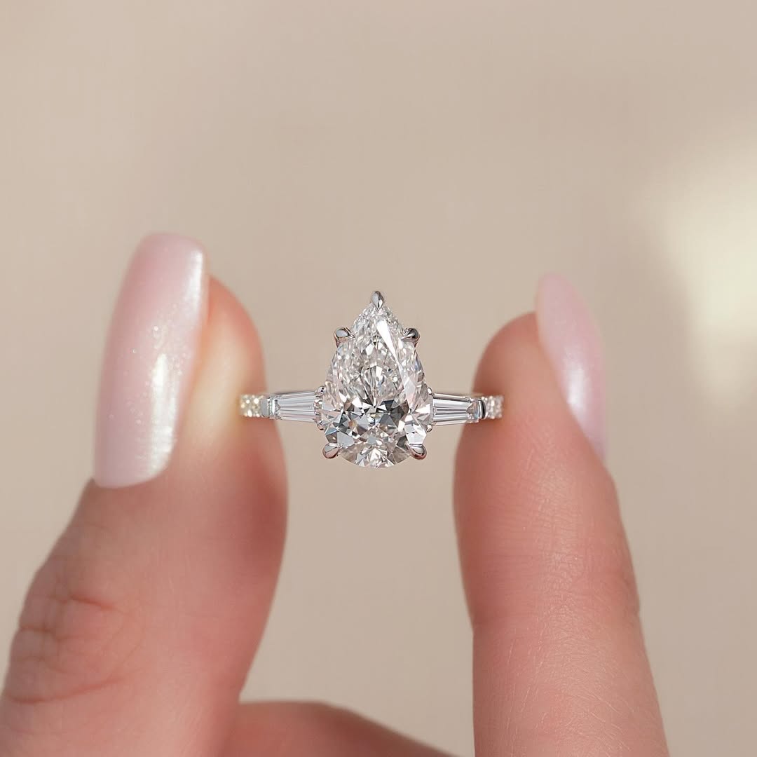✦A stunning 2.50CT pear cut lab grown diamond takes center stage in this three-stone pavé setting engagement ring, radiating elegant brilliance and fire. Flanked by two smaller side stones, the design symbolizes past, present, and future love while the pavé band adds luxurious sparkle. Crafted with ethically sourced lab grown diamonds, it offers sustainable elegance with timeless sophistication. Perfect for those who love classic beauty with a modern, radiant touch.