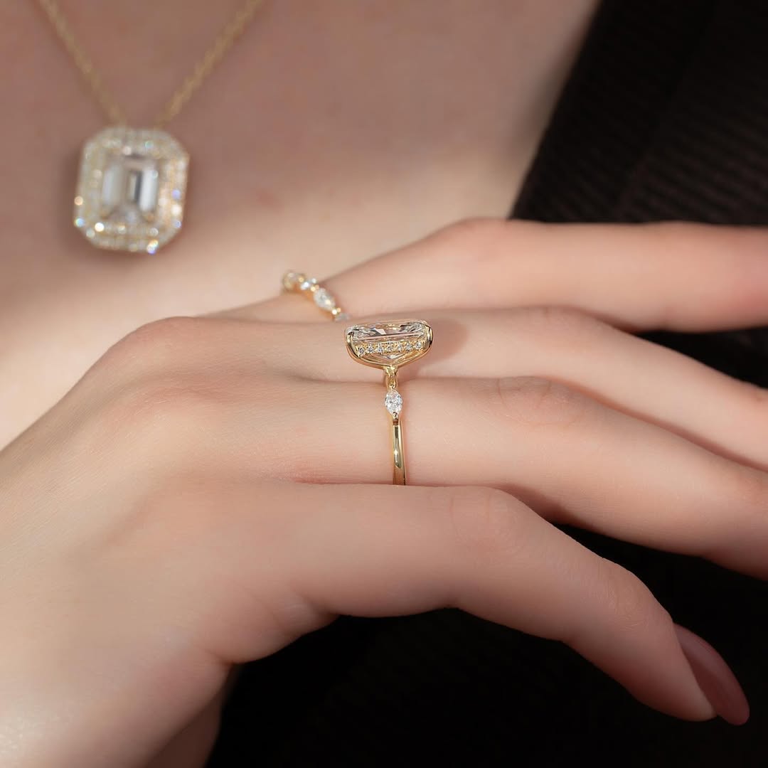 ✦A brilliant 2.50CT radiant cut lab grown diamond is beautifully framed by two sparkling side stones in this elegant three stone engagement ring. The radiant center delivers exceptional fire, while the side stones symbolize your past, present, and future. Crafted with ethically sourced lab grown diamonds, it offers sustainable luxury with timeless appeal. A perfect balance of classic symbolism and modern brilliance, designed to shine for a lifetime.