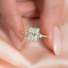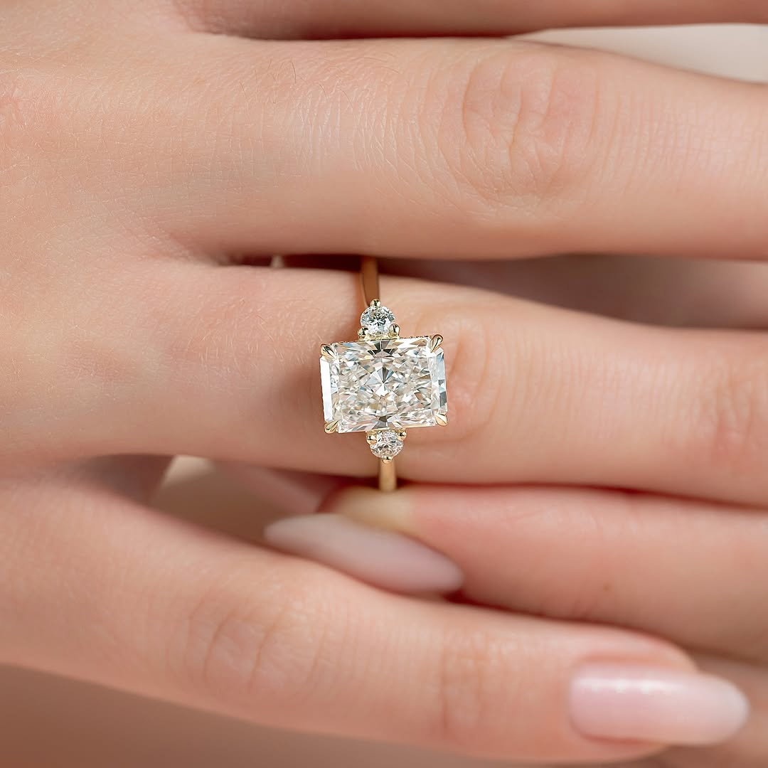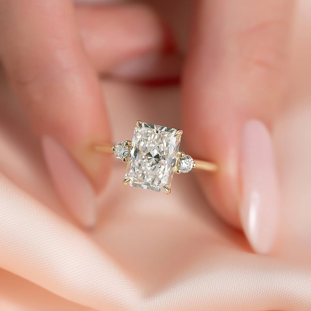 ✦Celebrate your journey together with this 3.0CT Radiant Diamond Three-Stone Lab-Grown Engagement Ring. The radiant-cut center stone delivers exceptional fire and brilliance, beautifully complemented by two sparkling side stones symbolizing the past, present, and future. Crafted with ethical lab-grown diamonds, it offers sustainable luxury with modern sophistication. Designed to enhance sparkle and balance, it creates a bold yet elegant look. This ring is a meaningful symbol of love and everlasting commitment.