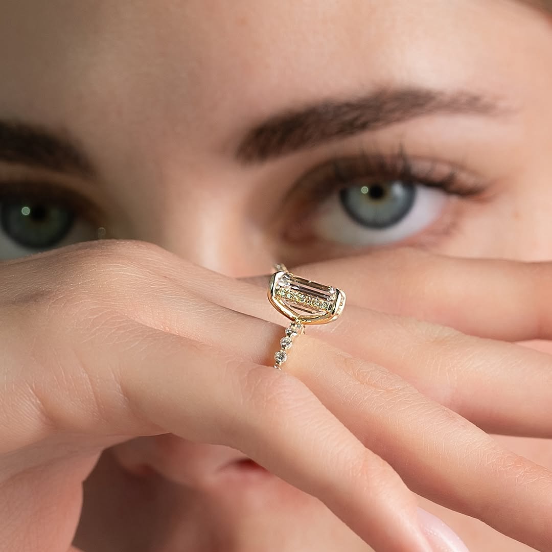 Our latest masterpiece is a modern engagement ring, available in solid gold or platinum, featuring a distinctive modified white diamond. We deliver high-end luxury pieces that exceed your expectations. Contact us now to design your own masterpieces.