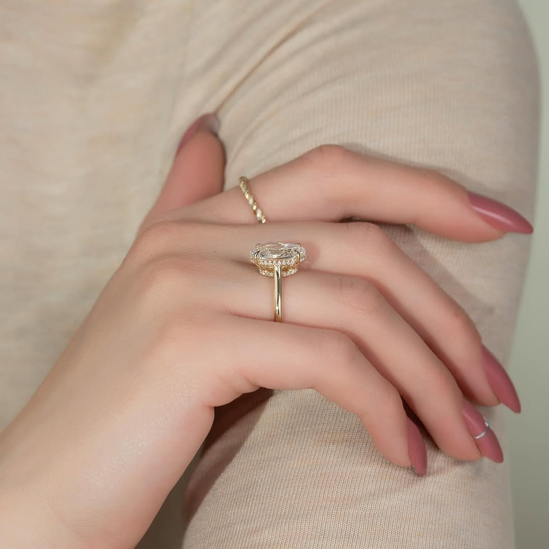 ✦A stunning 4.0CT oval cut lab grown diamond shines at the center of this hidden halo engagement ring, offering exceptional brilliance and elegance. The concealed halo subtly enhances the diamond’s sparkle while maintaining a sleek, refined silhouette. Crafted with ethically sourced lab grown diamonds, it delivers sustainable luxury with timeless sophistication. Perfect for those who love classic elegance with a modern, statement-making design.
