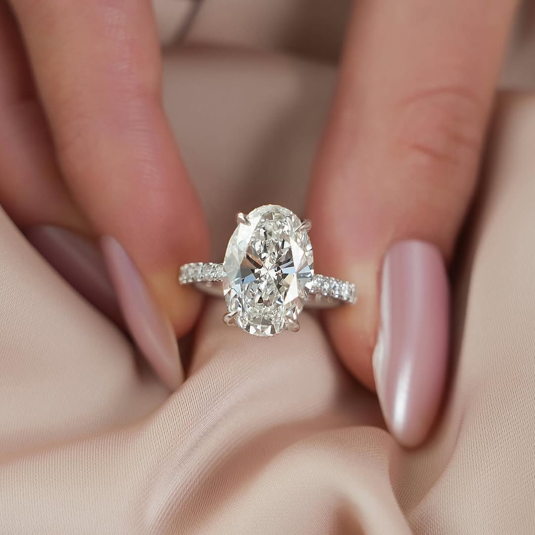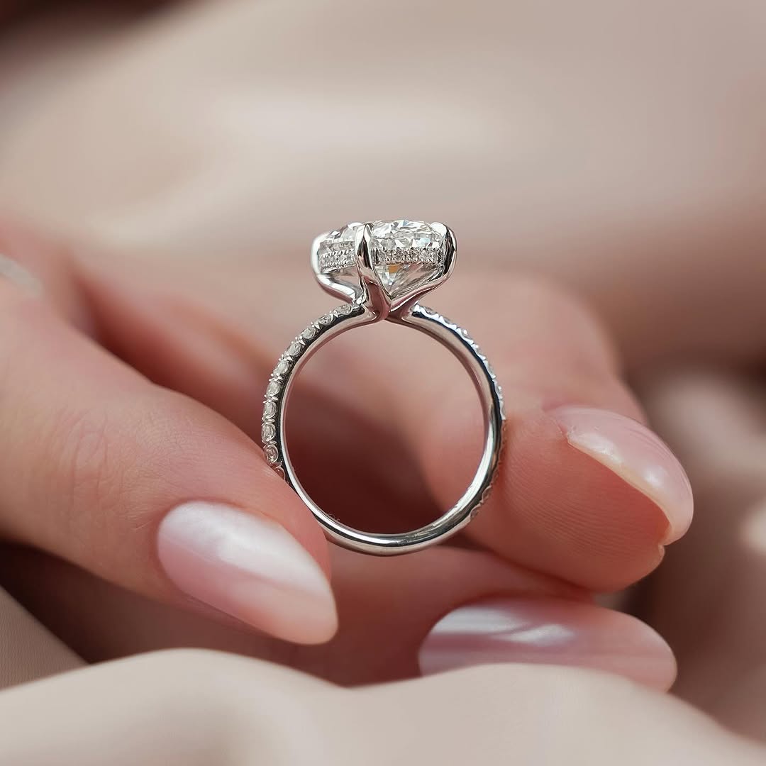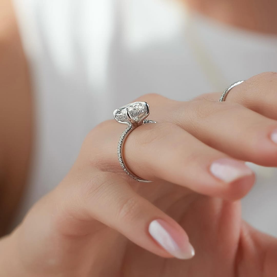 ✦Make a breathtaking statement with this 4.50CT Oval Diamond Pave Setting Hidden Halo Lab-Grown Engagement Ring. The elongated oval center stone delivers exceptional brilliance, beautifully enhanced by a subtle hidden halo for added sparkle. A shimmering pave band elevates the design with continuous radiance. Crafted with ethical lab-grown diamonds, it blends sustainable luxury with modern elegance. This ring is a stunning symbol of love, confidence, and lifelong commitment.