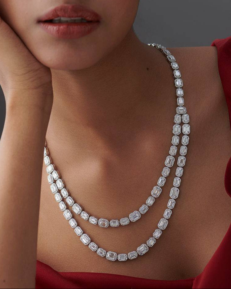 Emerald Cut Halo Set Two Layer Moissanite Wedding Necklace For Her