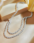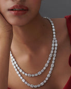 Radiate elegance with this Emerald Cut Halo Set Two Layer Moissanite Wedding Necklace for Her. Featuring dazzling emerald-cut moissanite stones encircled by halos of brilliance, it offers depth and sparkle from every angle. The two-layer design adds dimension and luxury to your bridal look. Crafted in premium gold for a refined, lasting finish. Each moissanite is hand-selected for clarity, fire, and symmetry. Perfect for weddings, receptions, or grand occasions. A timeless masterpiece that captures romance and radiance.