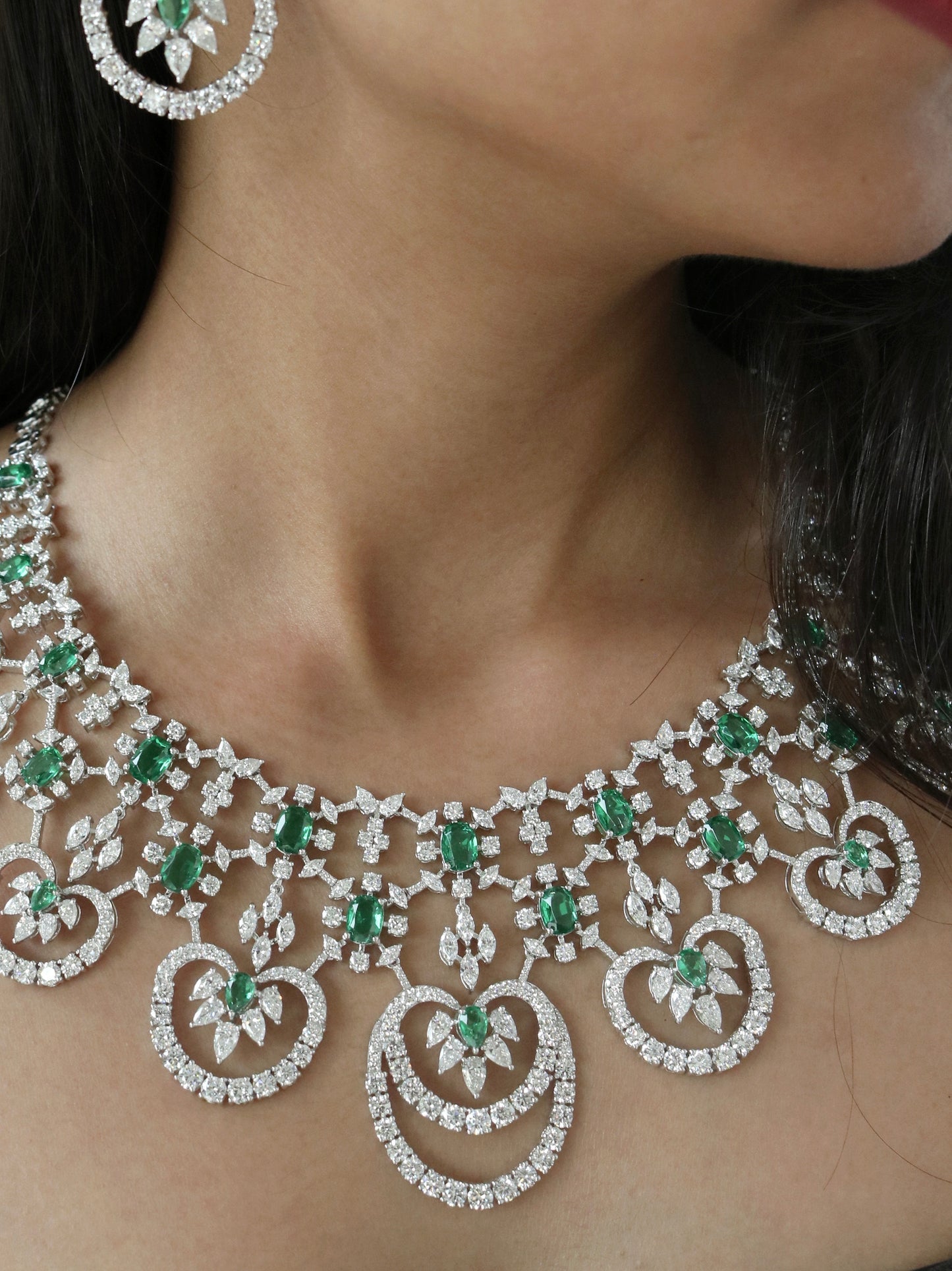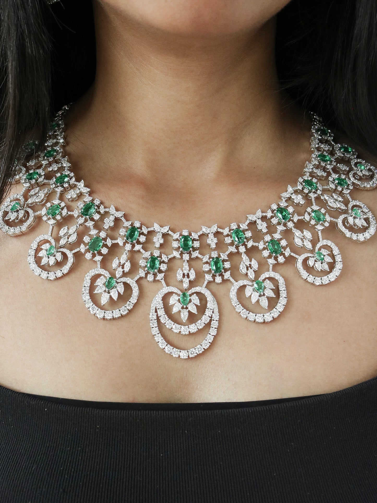 Immerse in elegance with this Luxury Green Emerald Gemstone Moissanite Necklace for Her. Showcasing 56.48TCW of vibrant green emerald gemstones paired with brilliant moissanite stones, it radiates regal charm. Crafted in 135 grams of premium gold, the design offers both opulence and timeless allure. The striking contrast between rich green hues and sparkling whites creates captivating depth. Each stone is handpicked for clarity, color, and brilliance. Perfect for weddings, festivities, or statement occasions. A breathtaking piece that defines luxury with bold sophistication.