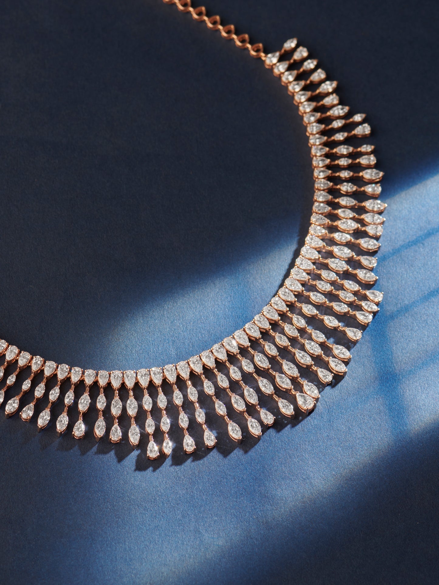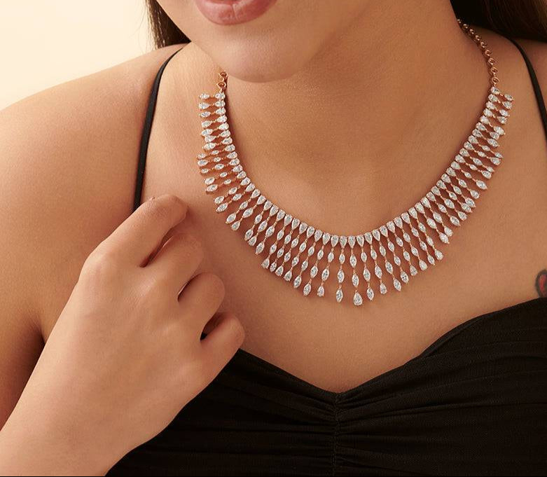Make a lasting impression with this luxury moissanite diamond wedding necklace, crafted to perfection for the modern bride. Featuring brilliant moissanite stones and dazzling diamond accents, it delivers exceptional fire and clarity from every angle. Expertly designed in solid gold, this wedding necklace for her offers timeless elegance with a contemporary edge. Ideal for bridal wear, anniversaries, or grand celebrations, it adds a radiant touch to any special moment. Each stone is meticulously set to create a seamless, fluid sparkle across the neckline. A perfect choice among luxury moissanite necklaces and diamond wedding jewelry, it embodies sophistication and grace. Designed to be cherished for a lifetime.