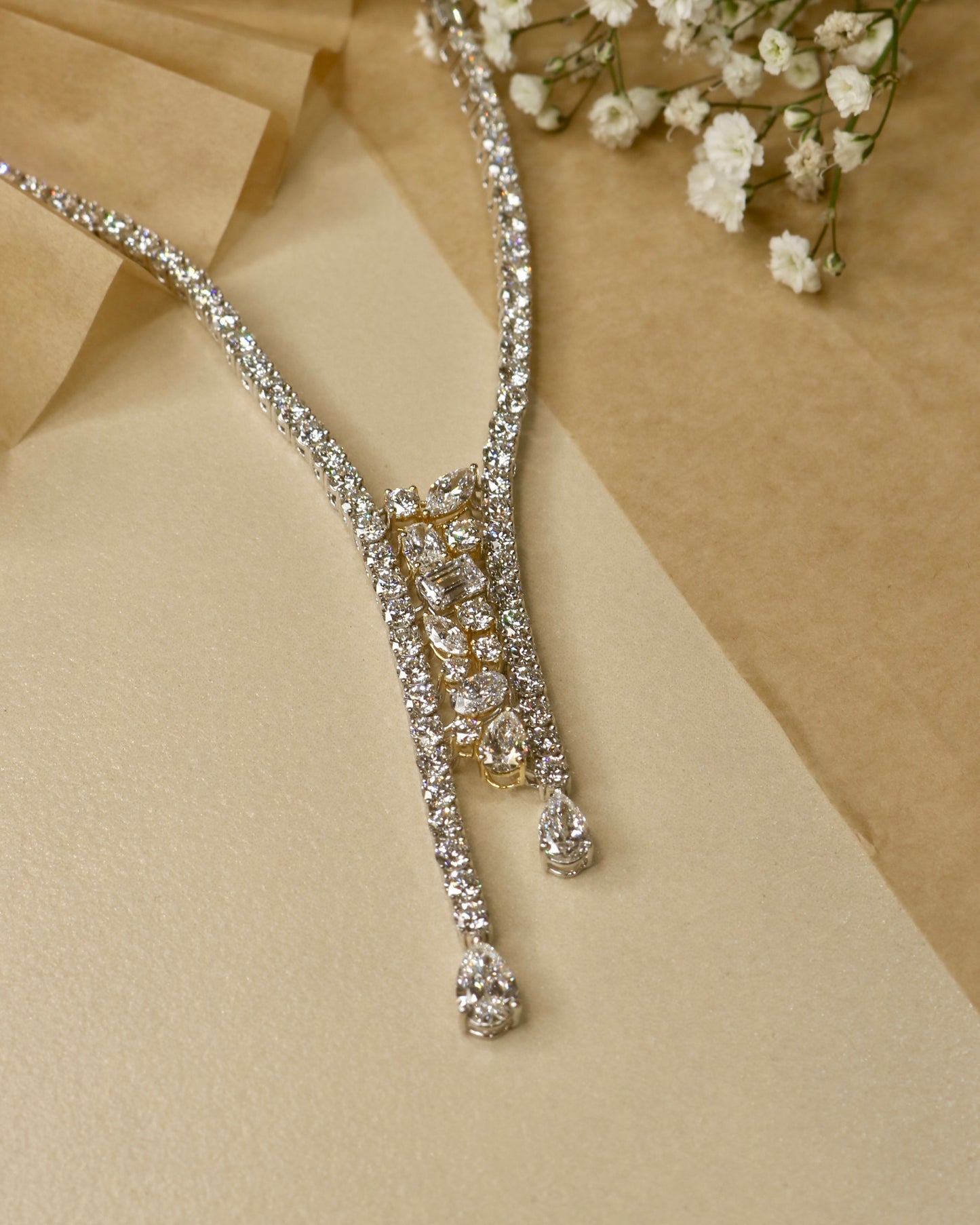 Make an unforgettable impression with this Multi Diamond Classic Party Wear Luxurious Unique Necklace. Designed with a stunning array of diamonds, it radiates timeless elegance and festive brilliance. The intricate layout ensures maximum sparkle and a refined finish. Crafted with precision in high-quality gold for enduring luxury. Perfect for soirées, weddings, and special celebrations. Each diamond is chosen for its exceptional clarity and fire. A one-of-a-kind masterpiece that defines grace and grandeur.