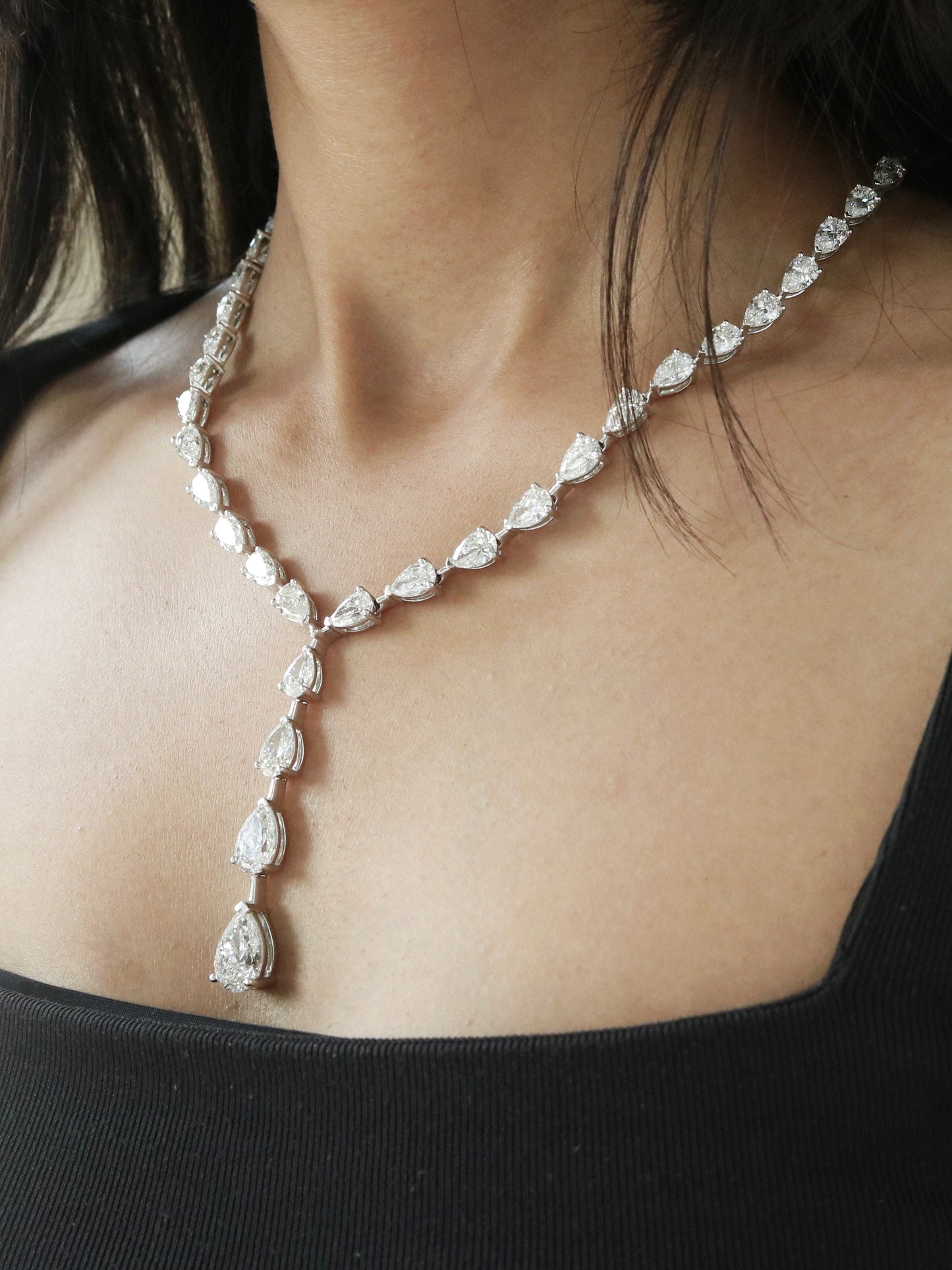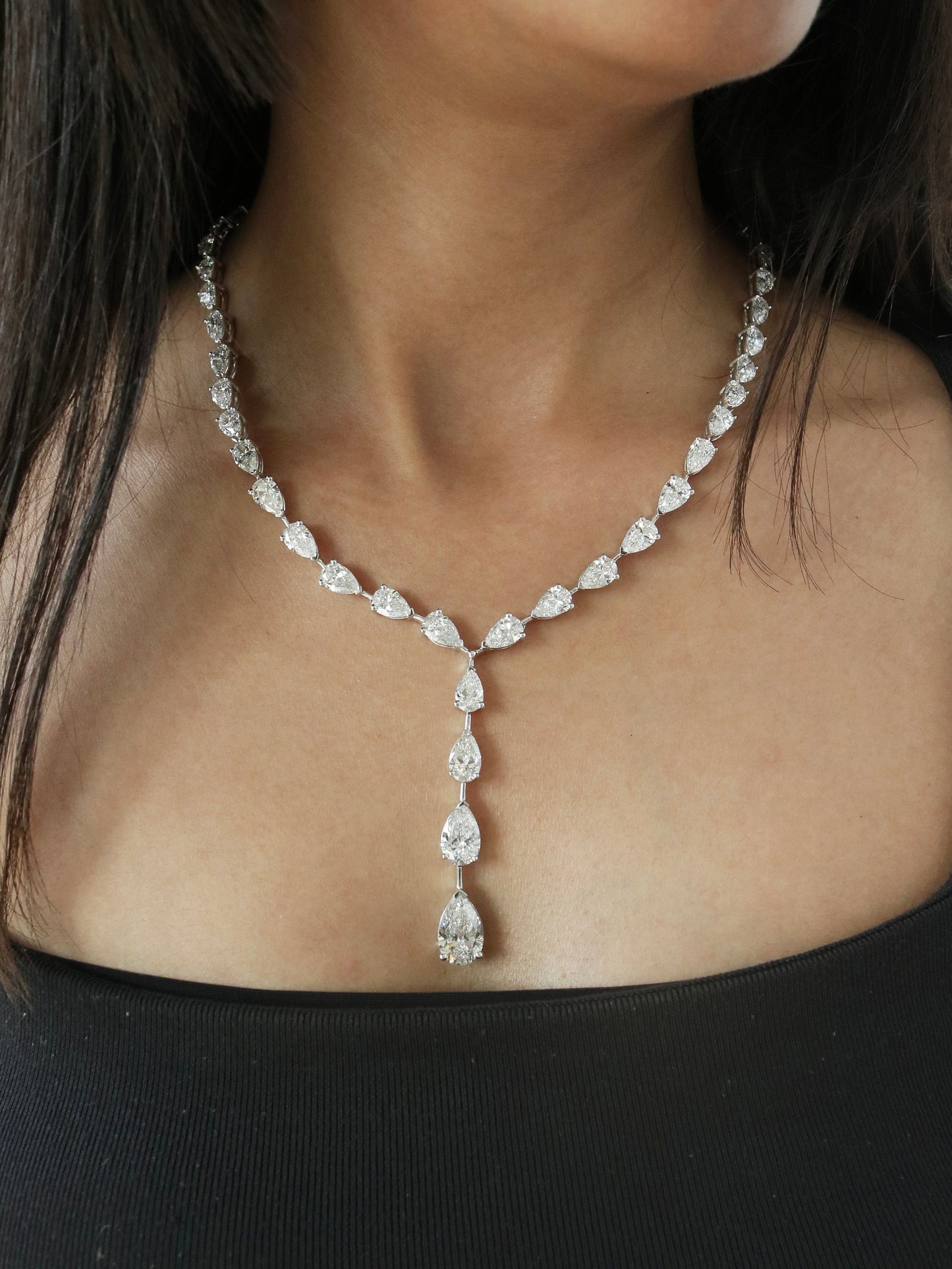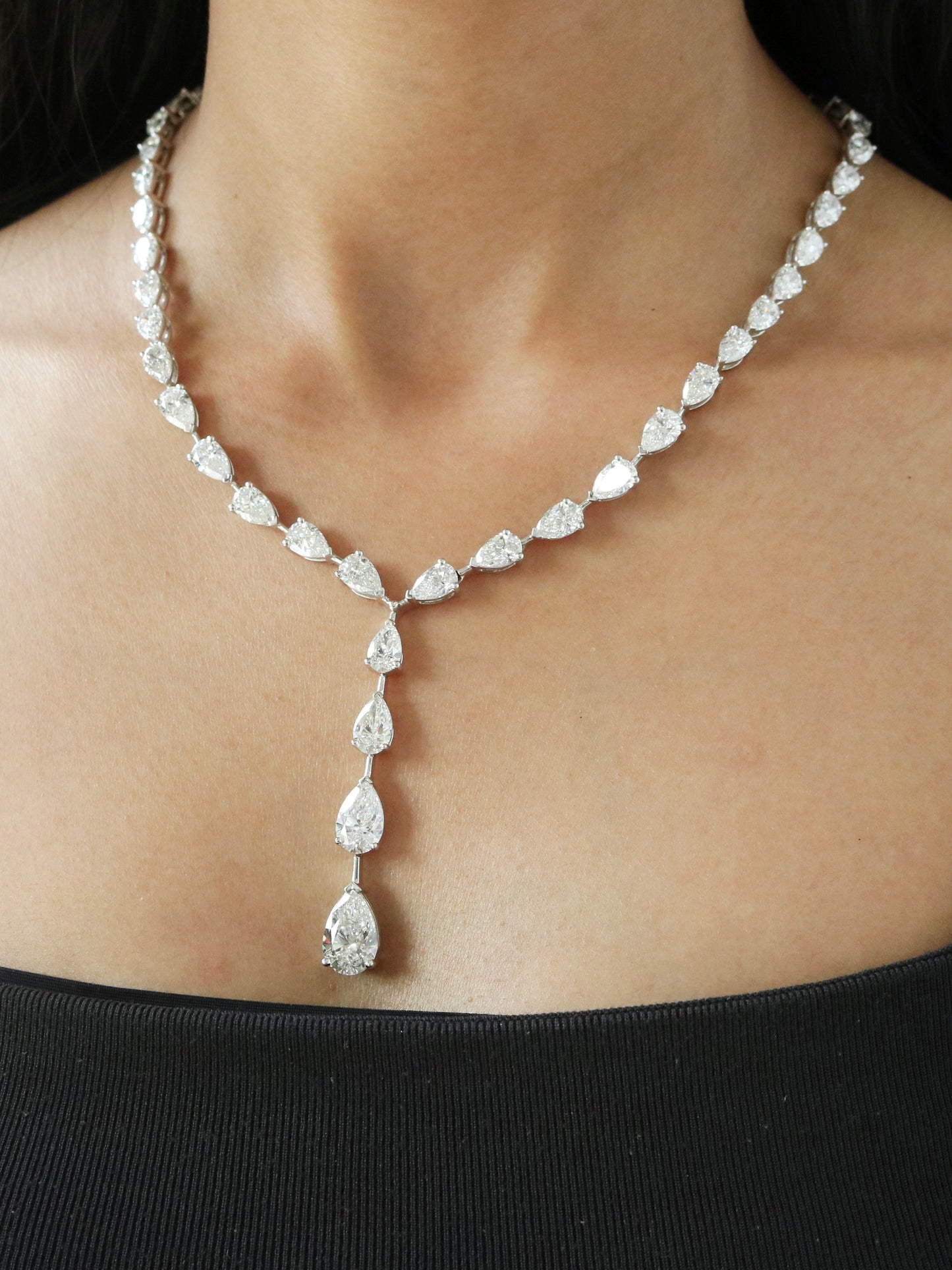 Grace any celebration with this Pear Cut Drop Style Moissanite Party Wear Necklace for Her. Featuring 33.81TCW of radiant pear-cut moissanite stones in an elegant drop design, it sparkles with every movement. Crafted in 38 grams of lustrous gold, it offers both luxury and comfort. The fluid silhouette adds sophistication to evening and festive attire. Each stone is handpicked for brilliance, clarity, and fire. Ideal for weddings, parties, or grand celebrations. A stunning piece that brings elegance to every moment.