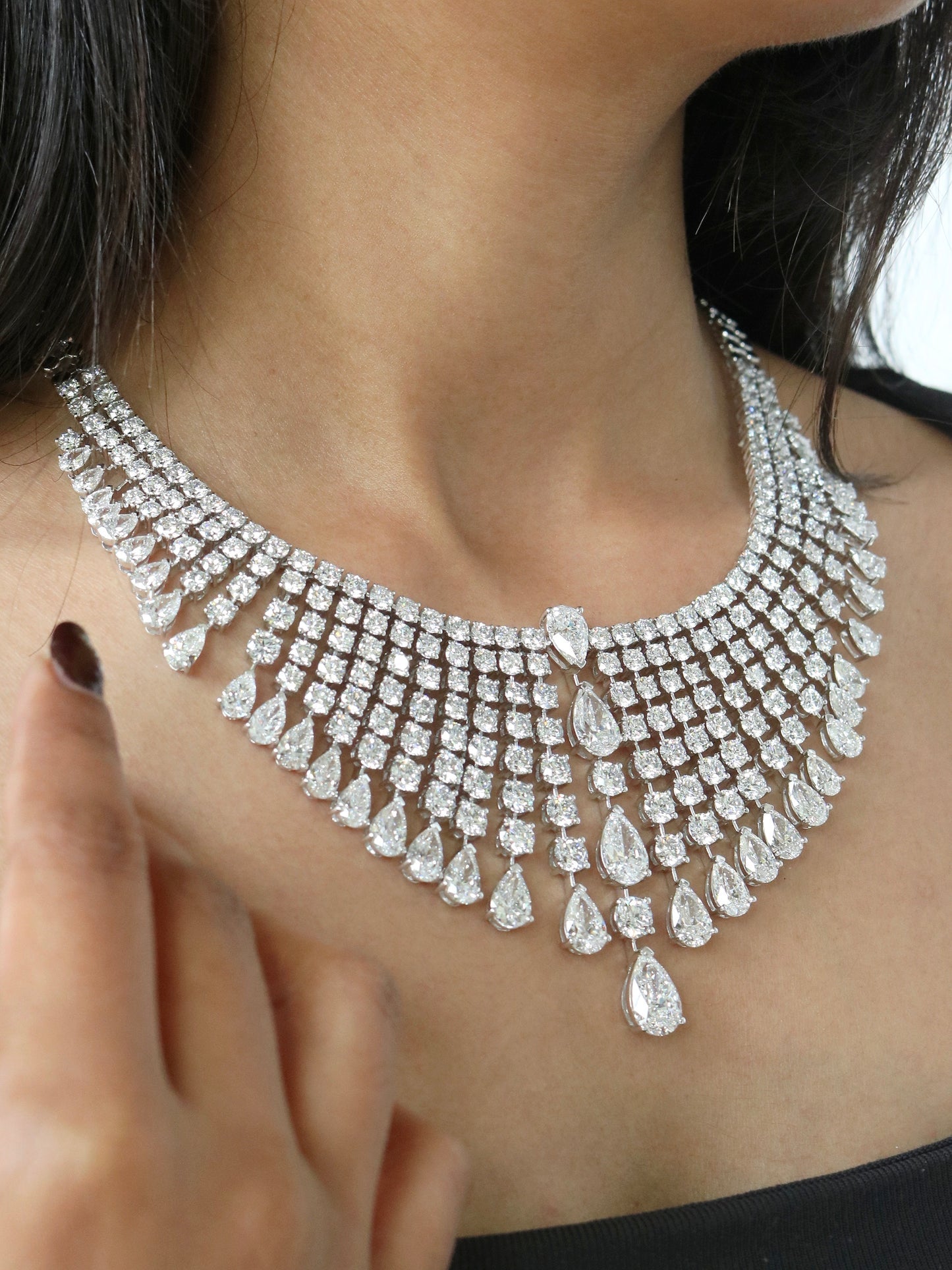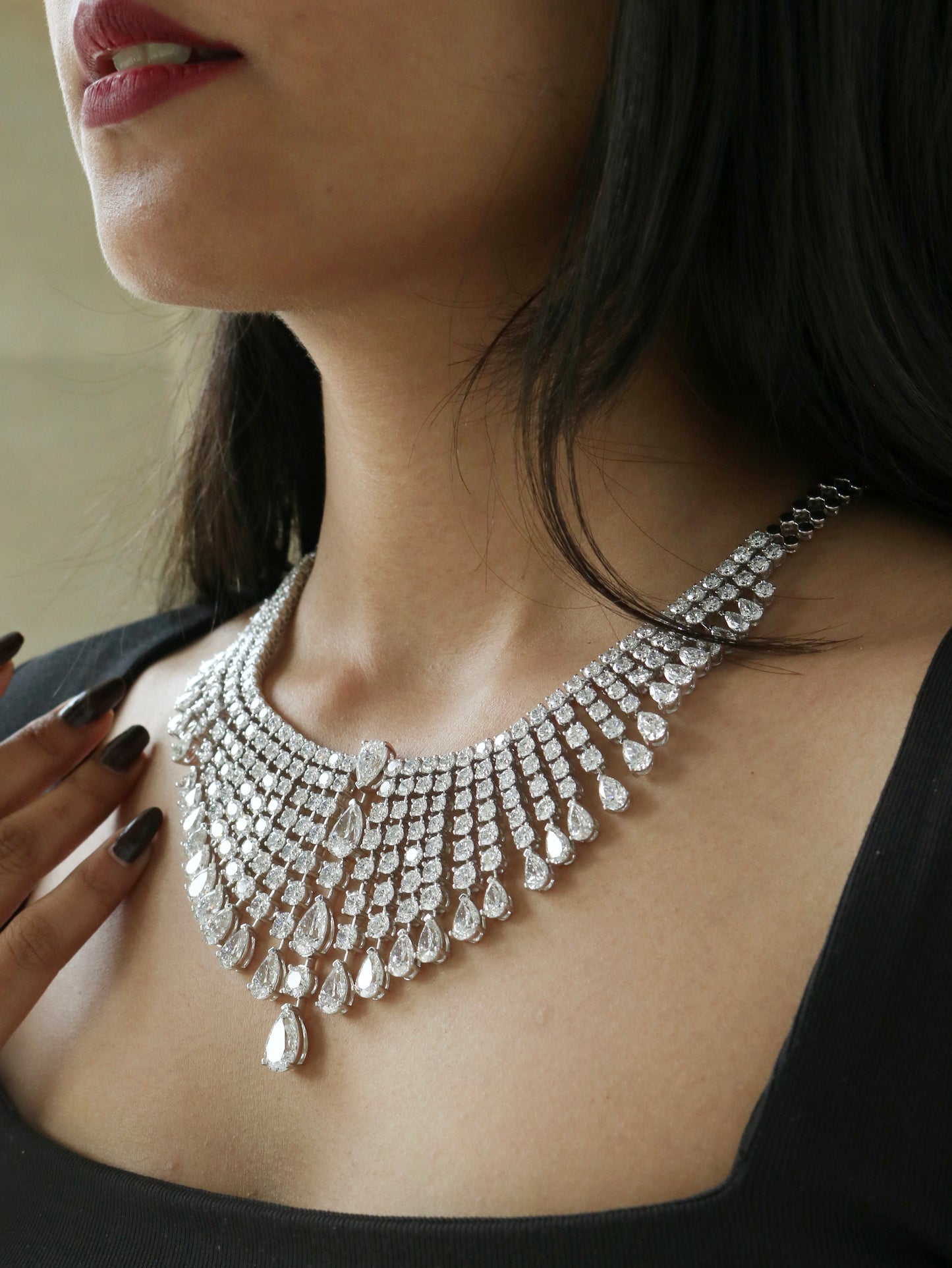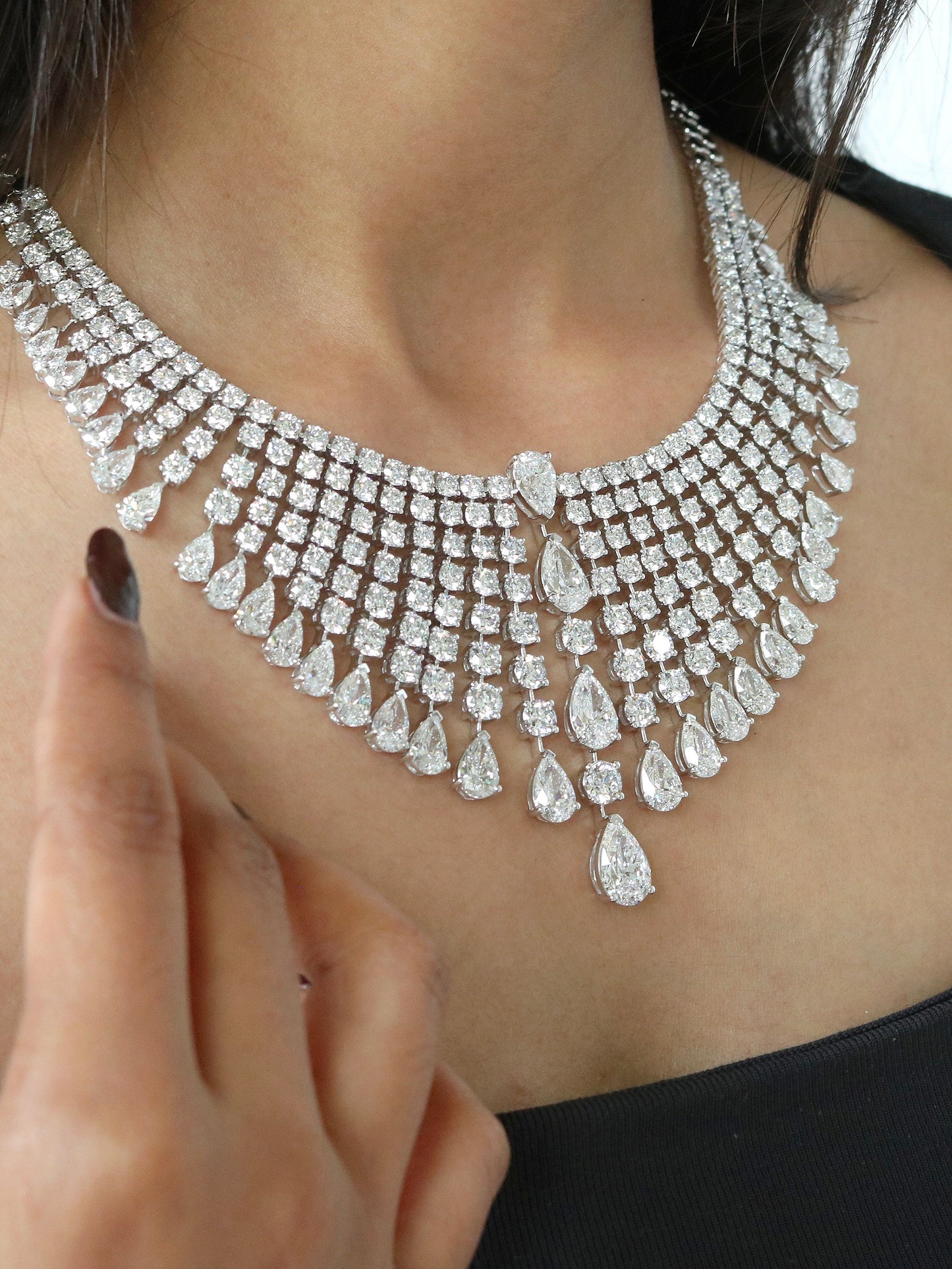 Elevate your bridal look with this Pear & Round Diamond Luxurious Wedding Necklace. Featuring a harmonious blend of pear and round-cut diamonds, it sparkles with classic elegance and modern allure. The design flows gracefully, offering brilliance from every angle. Expertly crafted in premium metal for a polished, lasting finish. Each diamond is hand-selected for exceptional clarity and fire. Perfect for weddings, receptions, or regal occasions. A timeless treasure that embodies luxury and love.