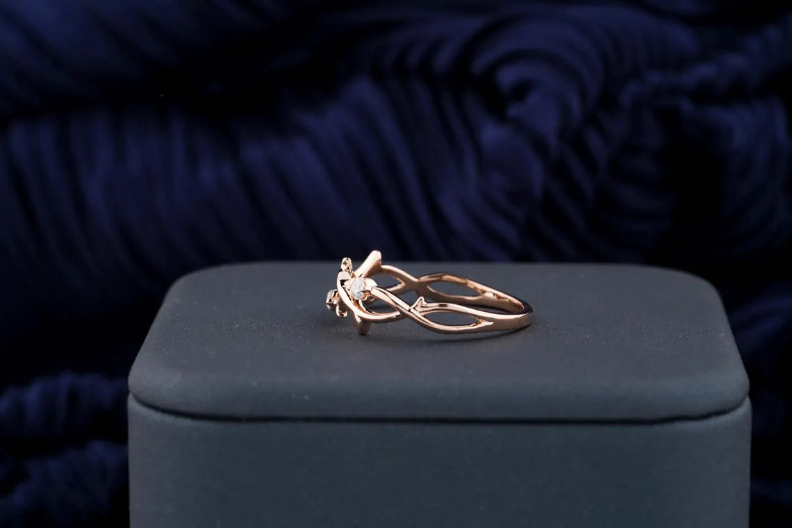 The 0.11 TCW Round Diamond Nature-Inspired Twig Moissanite Wedding Band features a delicate design that mimics the organic beauty of nature. With intricate twig-like details wrapping around the band, the round-cut moissanite stones add a subtle sparkle. This wedding band is perfect for nature lovers or anyone seeking a unique and timeless symbol of their love.