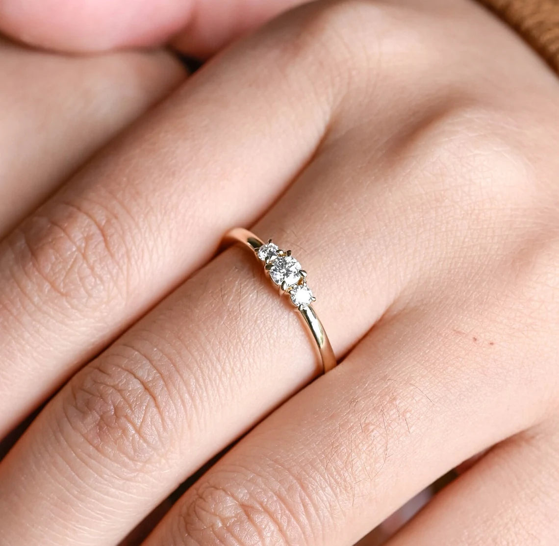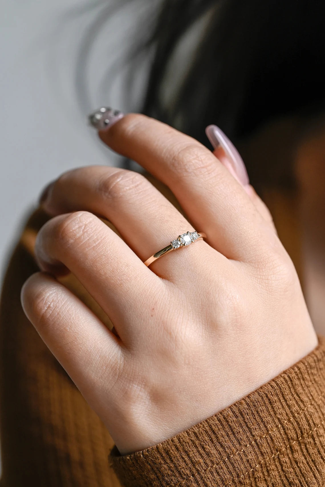 The 0.15TCW Round Brilliant Three Stone Moissanite Wedding Band features three sparkling round brilliant-cut stones, symbolizing the past, present, and future. Each stone is meticulously set to enhance the ring's minimalist elegance, offering a subtle yet meaningful design. Crafted with high-quality moissanite, the stones deliver exceptional brilliance and fire. This band is perfect for those seeking a classic, romantic touch in their wedding jewelry while maintaining a modern and understated style.