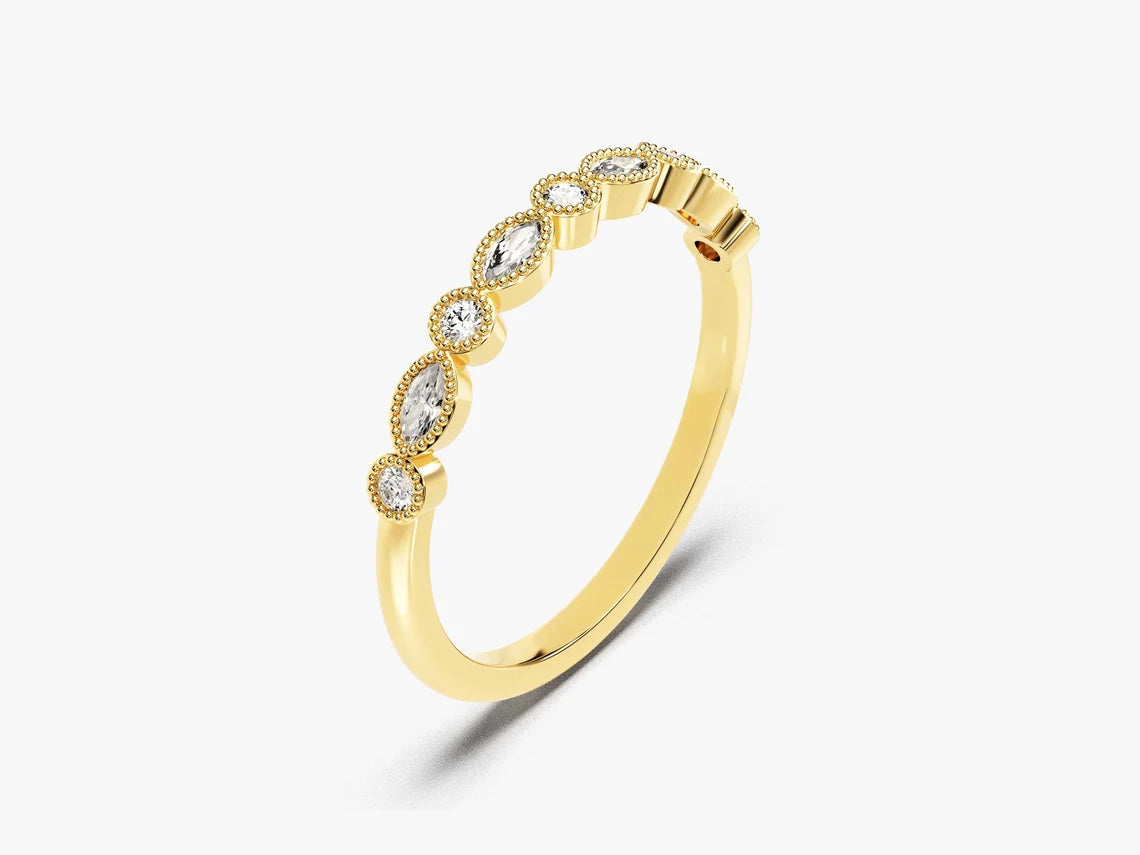 The Marquise & Round Diamond Moissanite Wedding Band is a stunning blend of elegance and sparkle, designed to celebrate your love. This exquisite band features a captivating arrangement of marquise and round-cut diamonds, each carefully set to maximize brilliance and create a dazzling effect. Crafted with high-quality moissanite, it offers the beauty of traditional diamonds while being an ethical and sustainable choice. Its unique combination of shapes adds a touch of sophistication, making it the perfect complement to your engagement ring or a striking stand-alone piece that symbolizes your everlasting commitment.